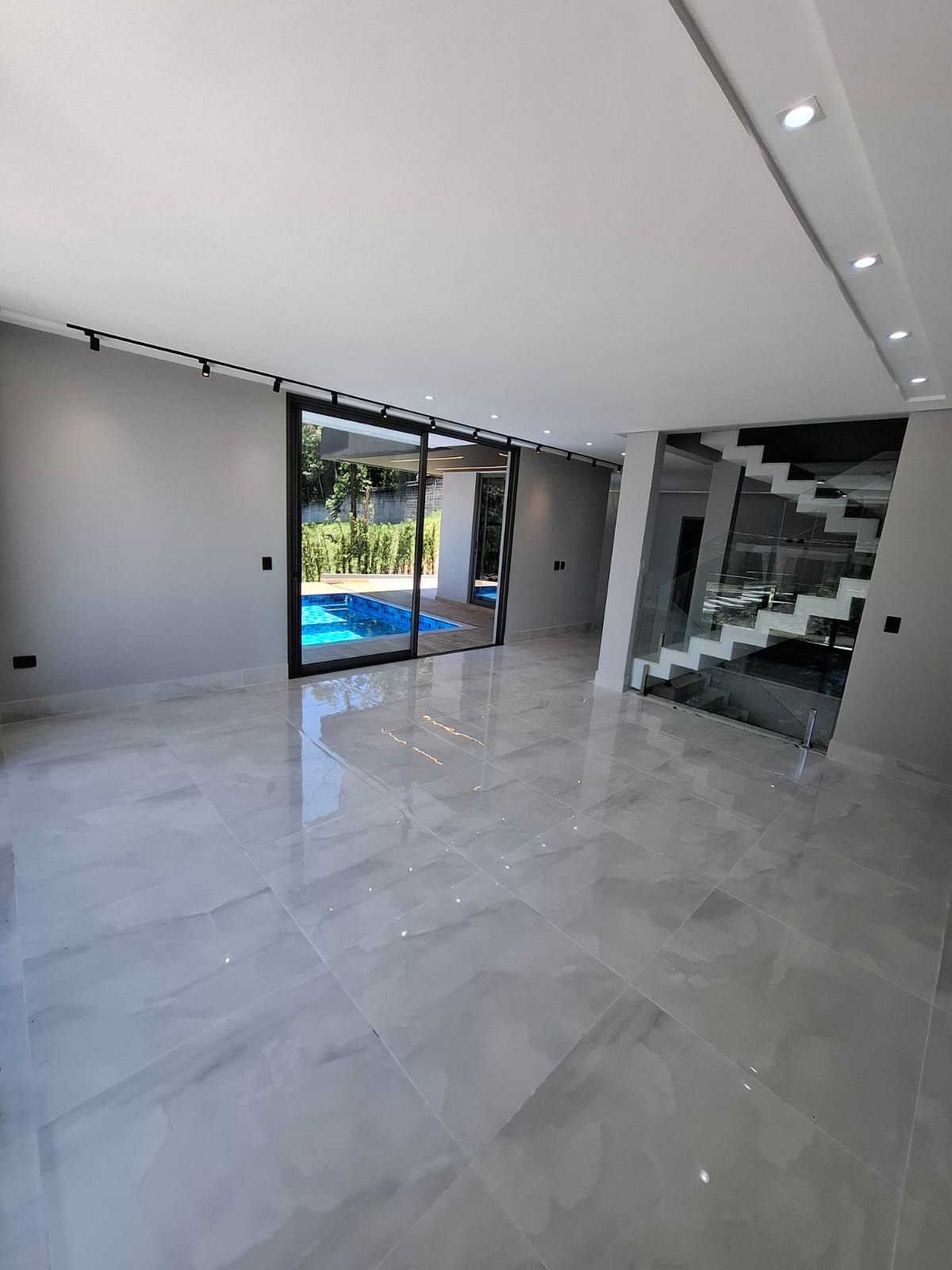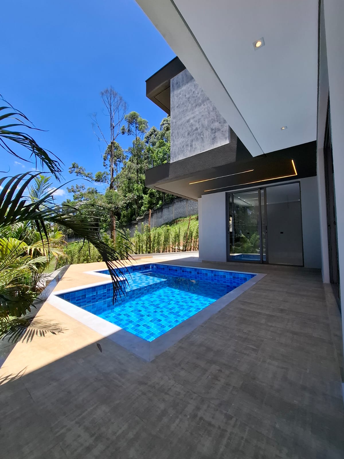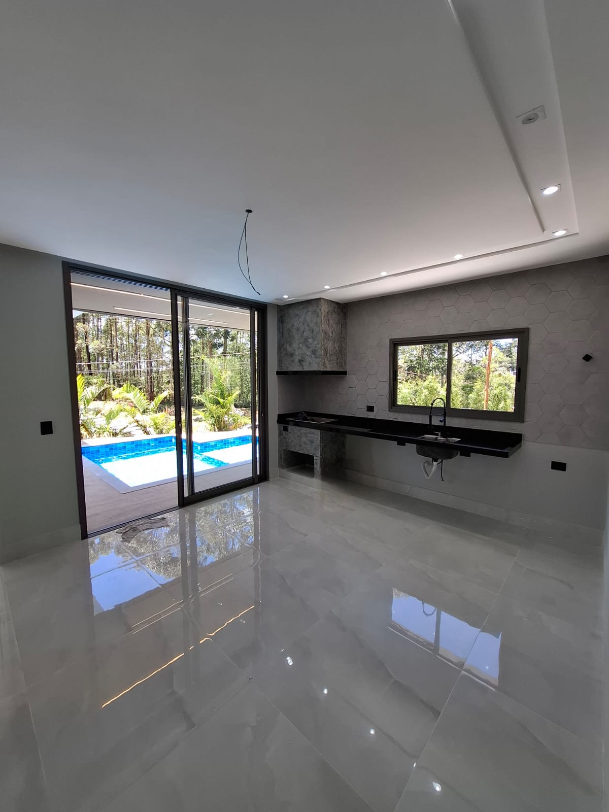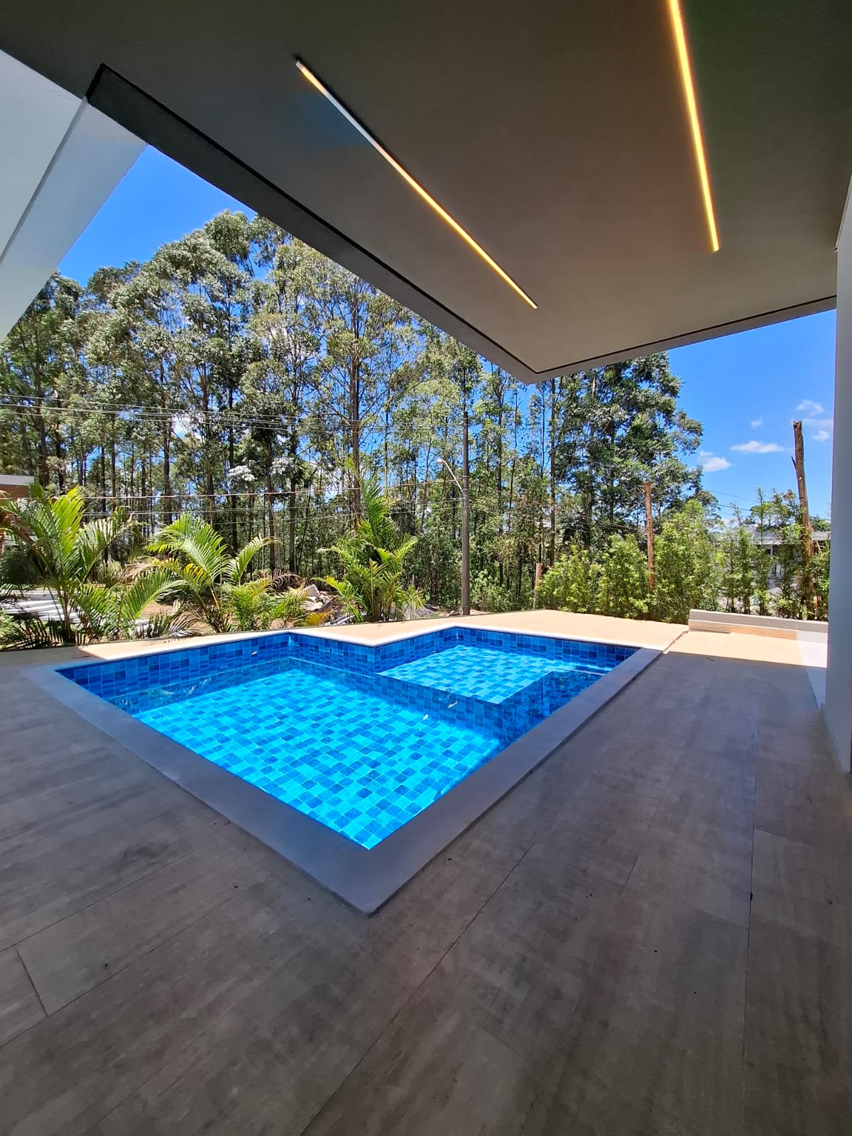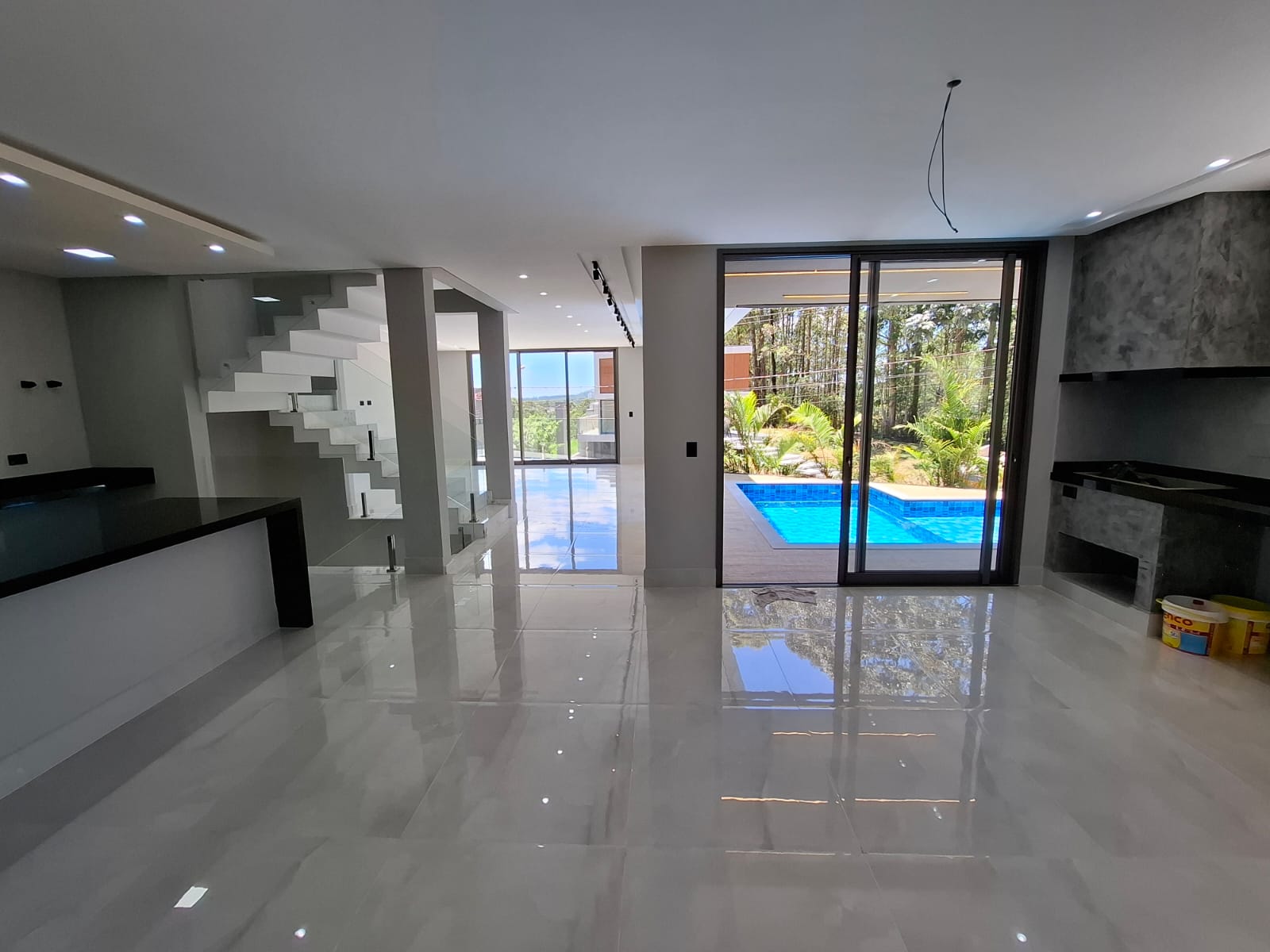 Amplo loft com sala de jantar, sala tv, cozinha, espaço gourmet, despensa, lavanderia, banheiro da pisicna, piscina e área social com vista para área de preservação do condomínio